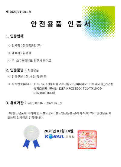 철도안전용품 인증서(26.02~29.02)