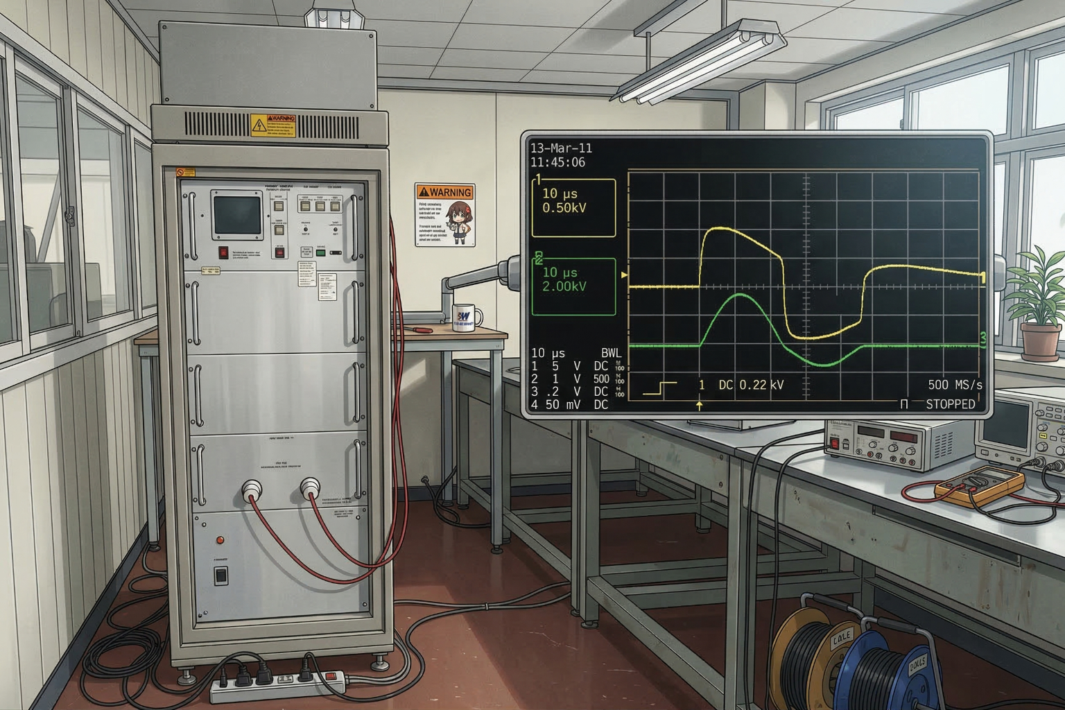 임펄스 전압을 인가하고 권선의 파형을 비교하여 턴간의 절연 상태를 확인 할 수 있습니다.